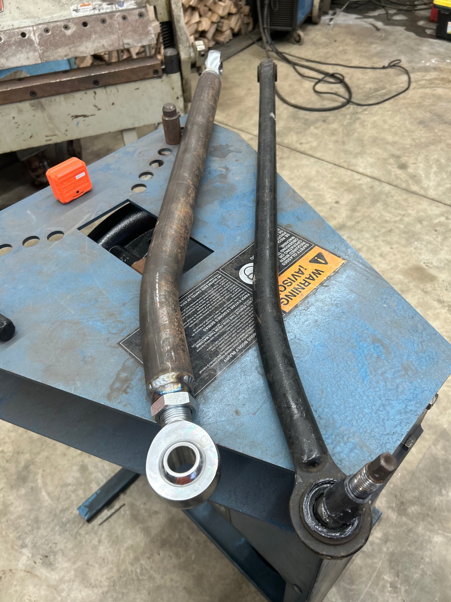 Made out of 2”x.250 wall DOM tubing with 1.25 heims at BOTH ends. Eliminates the ball joint on the axle side which causes excess death wobble.